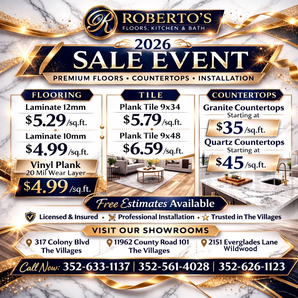 At Roberto’s Flooring, we provide premium flooring, kitchen, and bath remodeling services designed to make your home more beautiful, comfortable, and valuable. With years of experience serving The Villages, FL community, our team delivers honest work, exceptional craftsmanship, and results you’ll love for years to come.